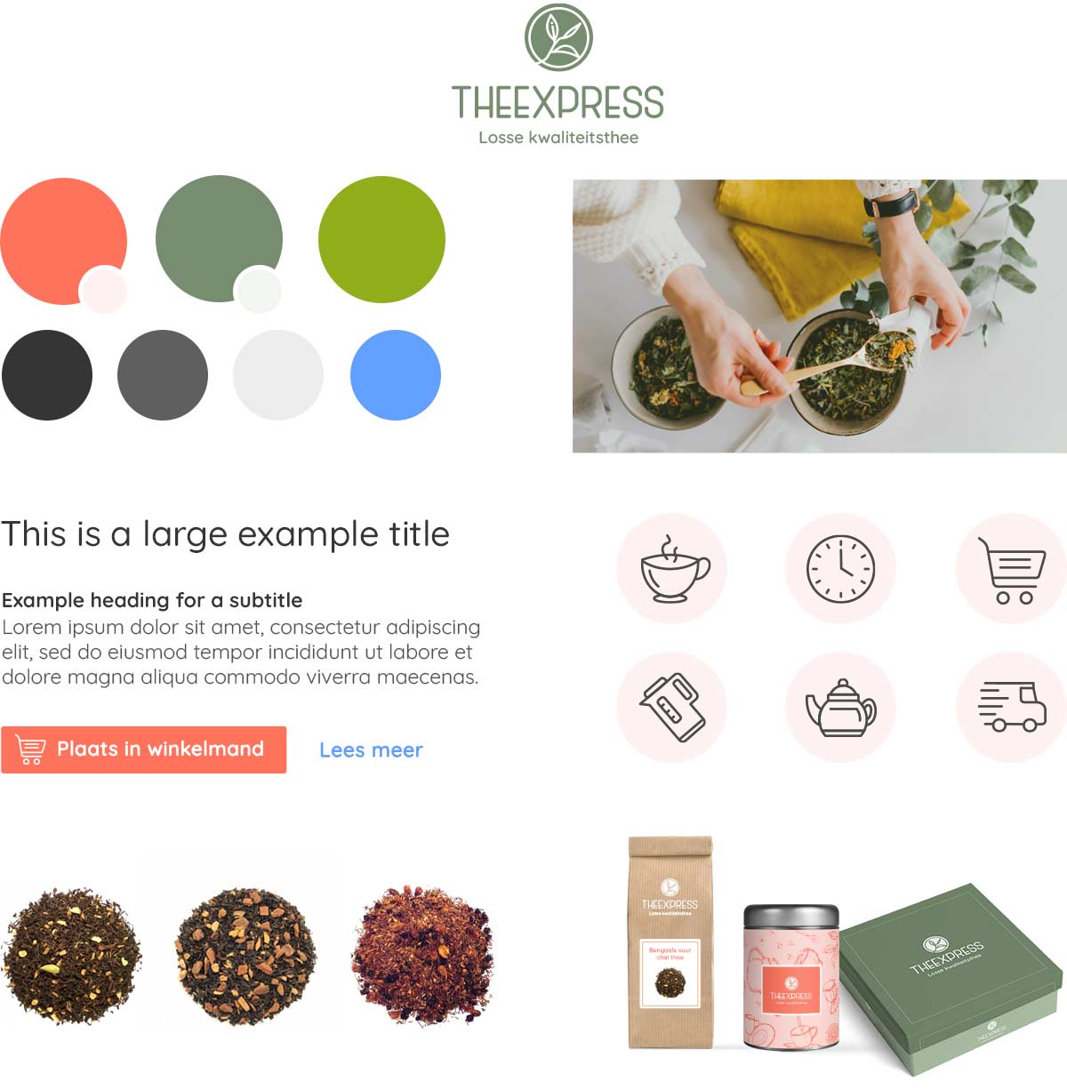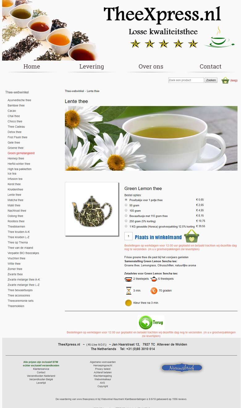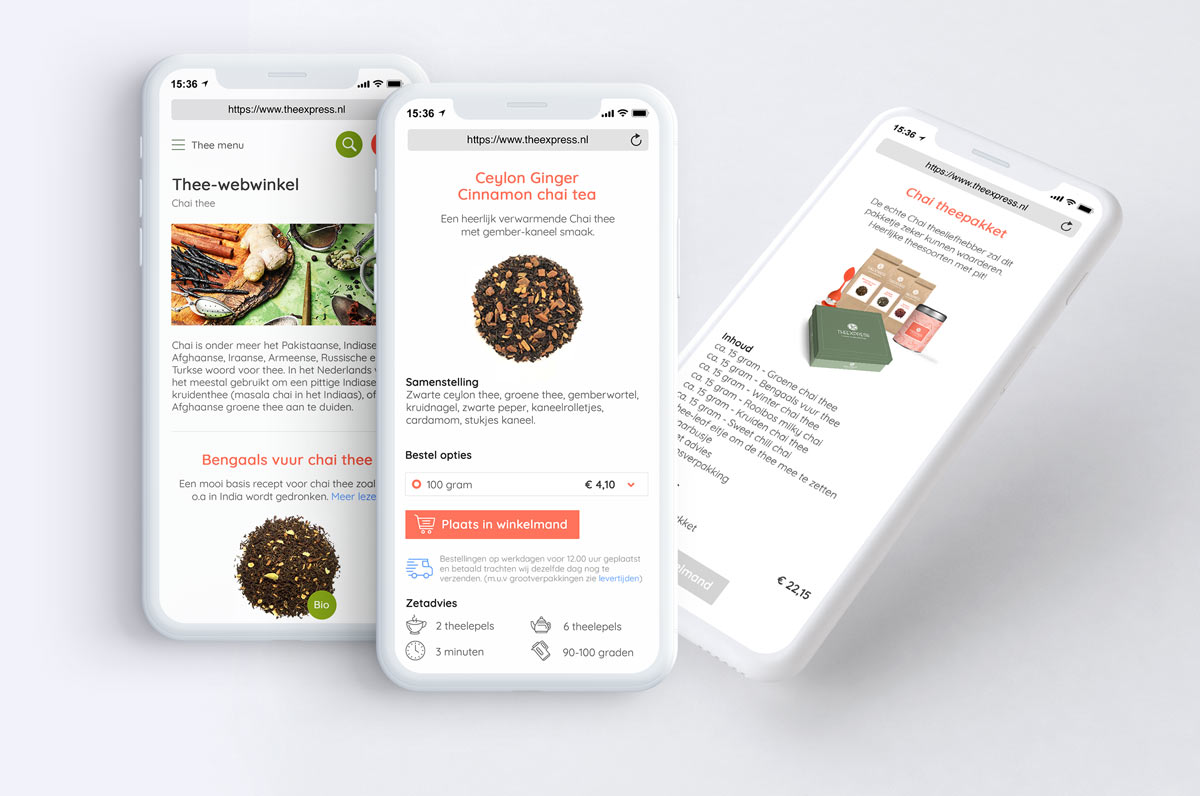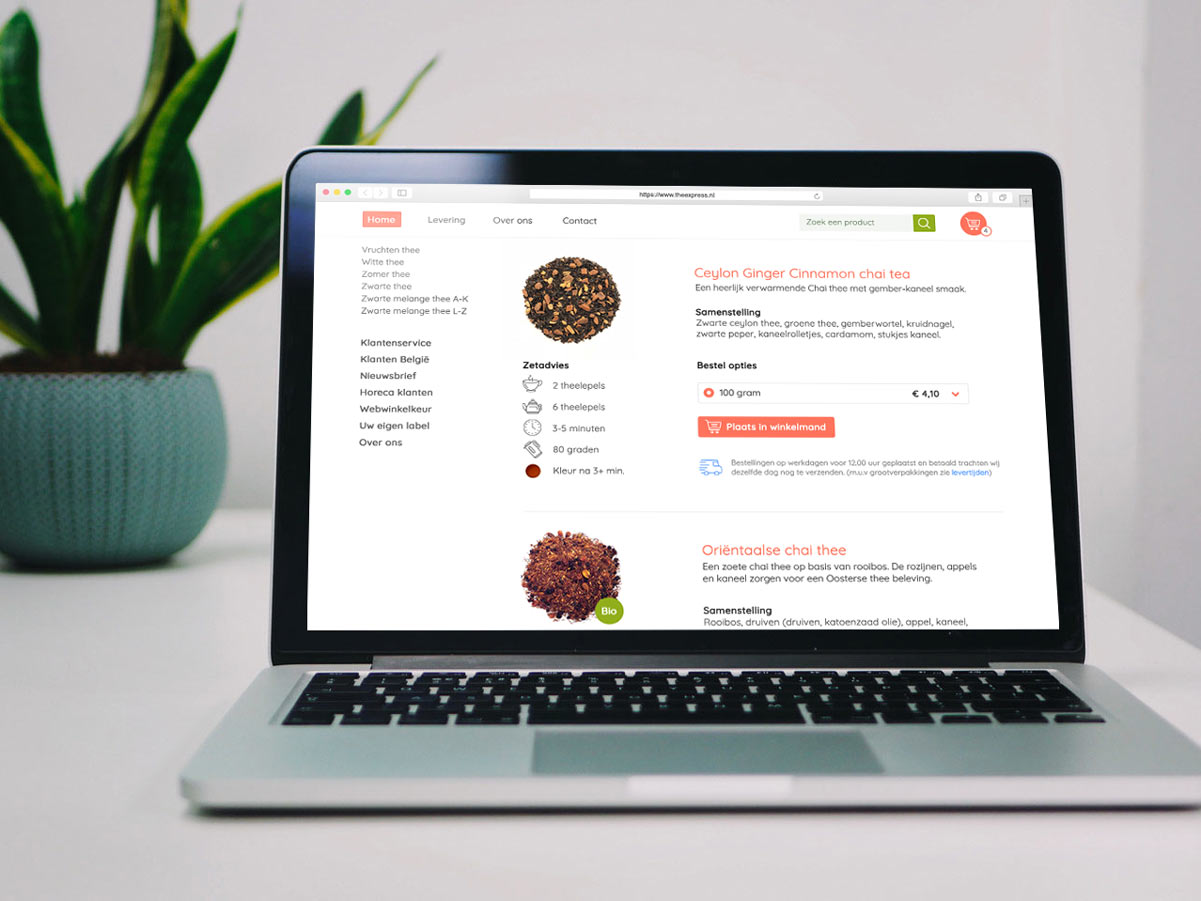 Als theeliefhebber weet je dat er meer is dan enkel thee uit de supermarkt. Daarom kwam ik ooit de website theexpress.nl tegen. Blij werd ik van het grote aanbod aan thee, minder blij van de look & feel van de website. Daarom besloot ik als eigen project de branding van TheeXpress te gaan verbeteren. Ik heb mij gefocust op het ontwikkelen van een nieuw logo, een styletile, de homepage en een productpagina.